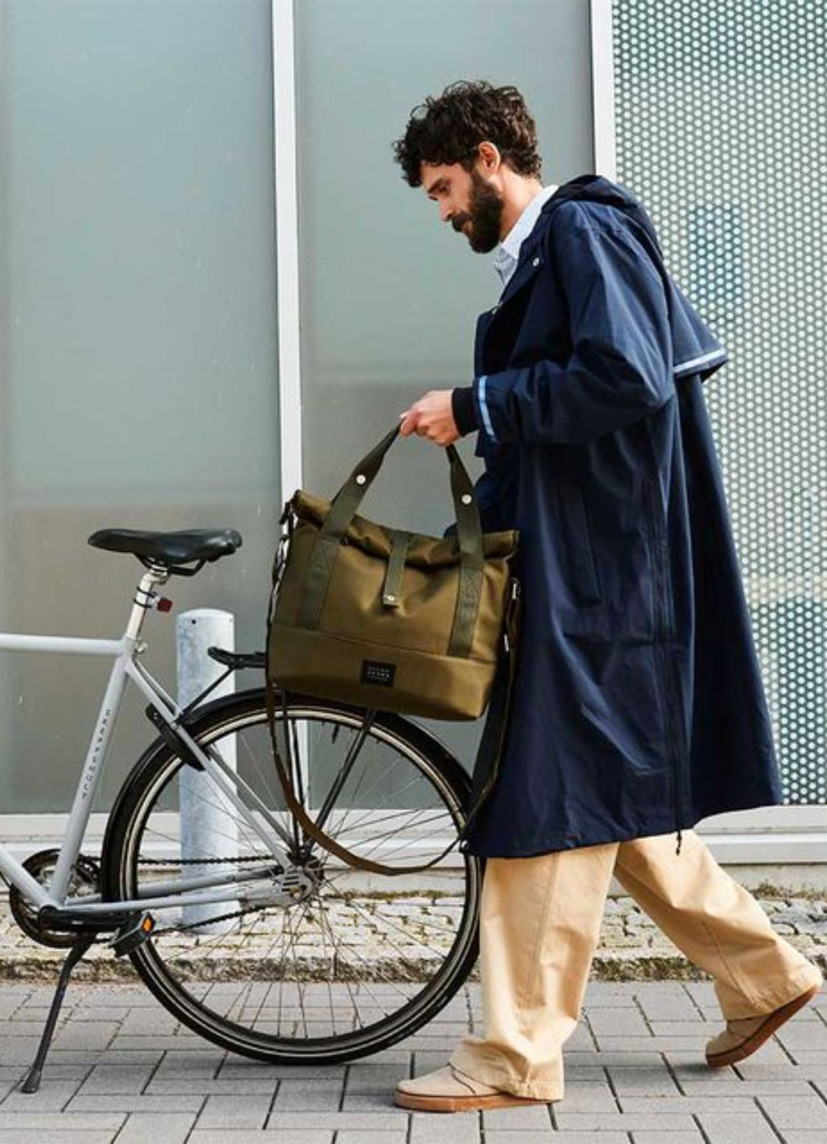 Hooks onto the luggage rack while you're on the bike