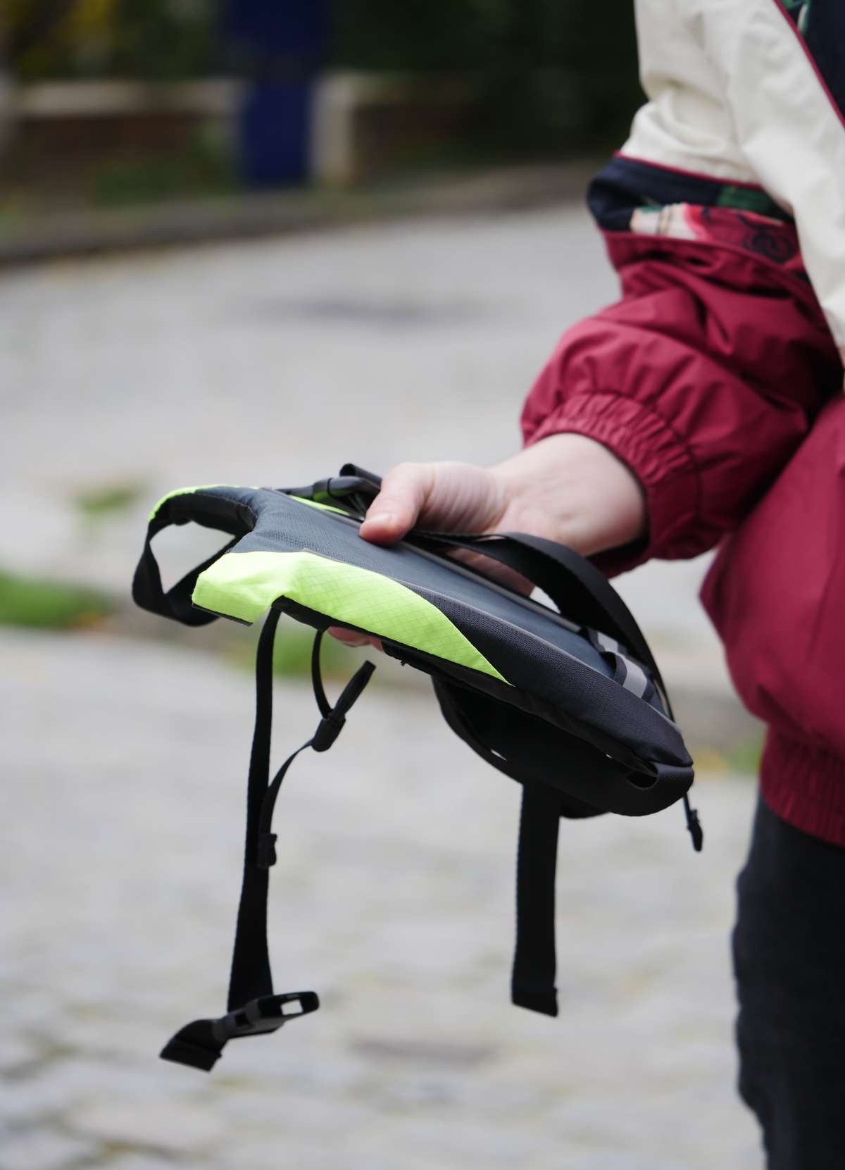 0.245 kg.Material: 100% polyester fabric.Adjustable shoulder straps.Thick mesh pocket on the back.Lithium battery: 500mAh: Rechargeable via USB cable (included).Remote control: Batteries included / 2x CR2032 (non-rechargeable).IPX-5 certified.