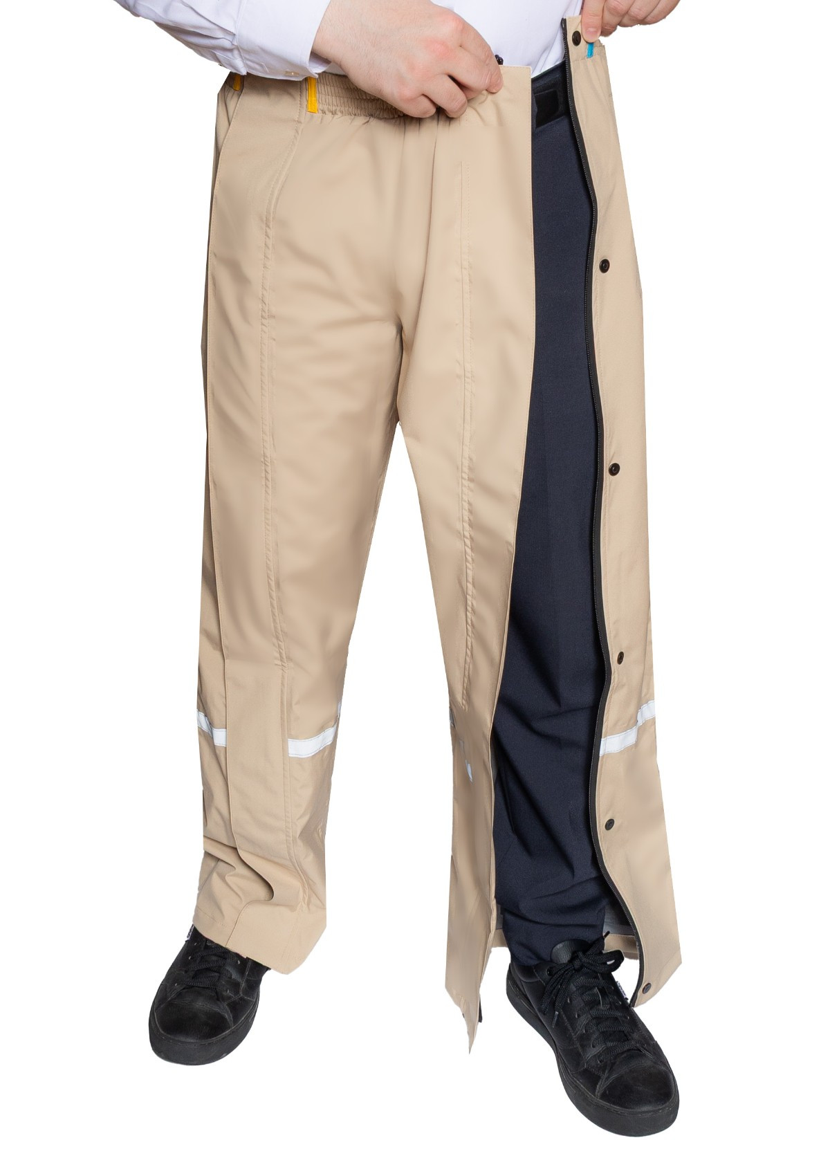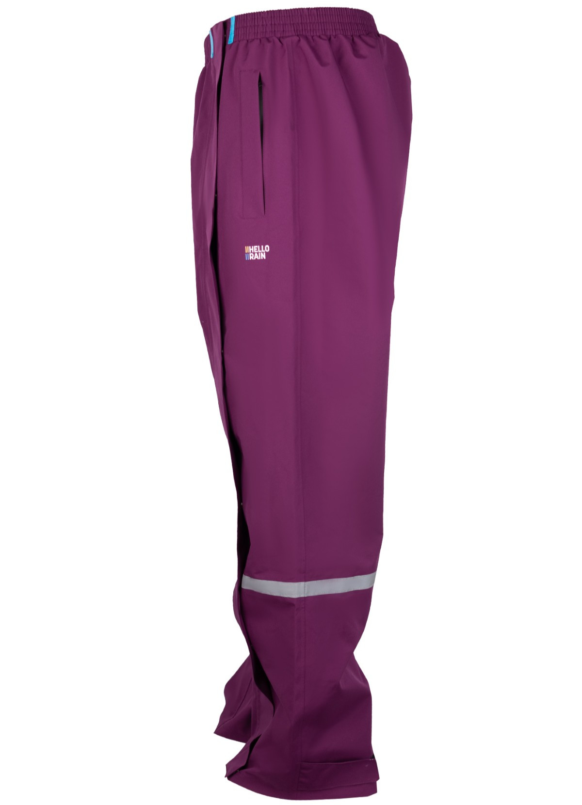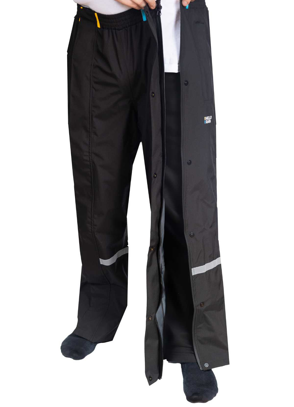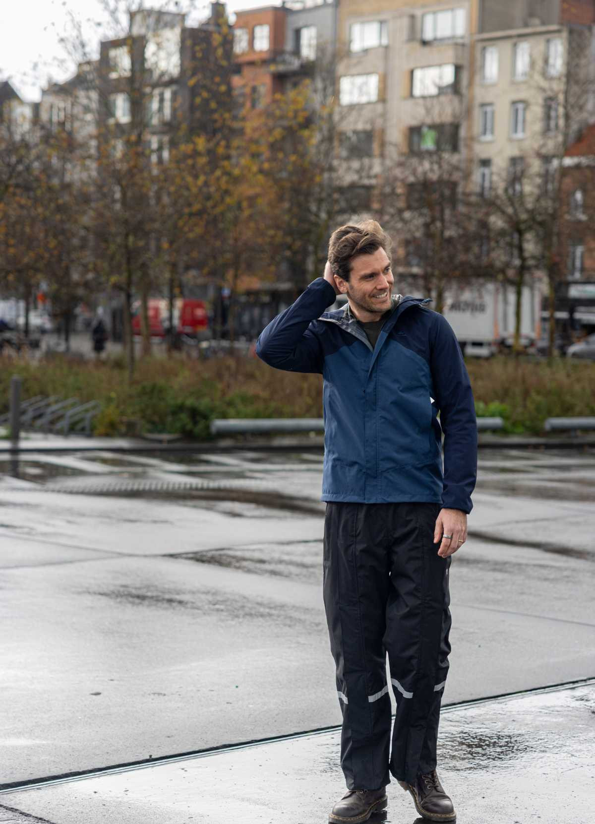 Details: Waterproof: 3 premium layers, 10,000 mm water column Windproof and breathable: 5,000 g/m²/li>LightweightUnique waterproof two-way full-length zipper with magnetic flap overlayElastic waistband for comfortReflective details on both legs for added safety. Waterproof zipper openings on both sides for access to your pockets. Velcro closure at the bottom of the legs.Water column: 10,000 mm (3 layers) Breathability: 5,000 g/m² (3 layers), waterproof seams PFAS-free, C0 certifiedComposition: Polyester./strong>