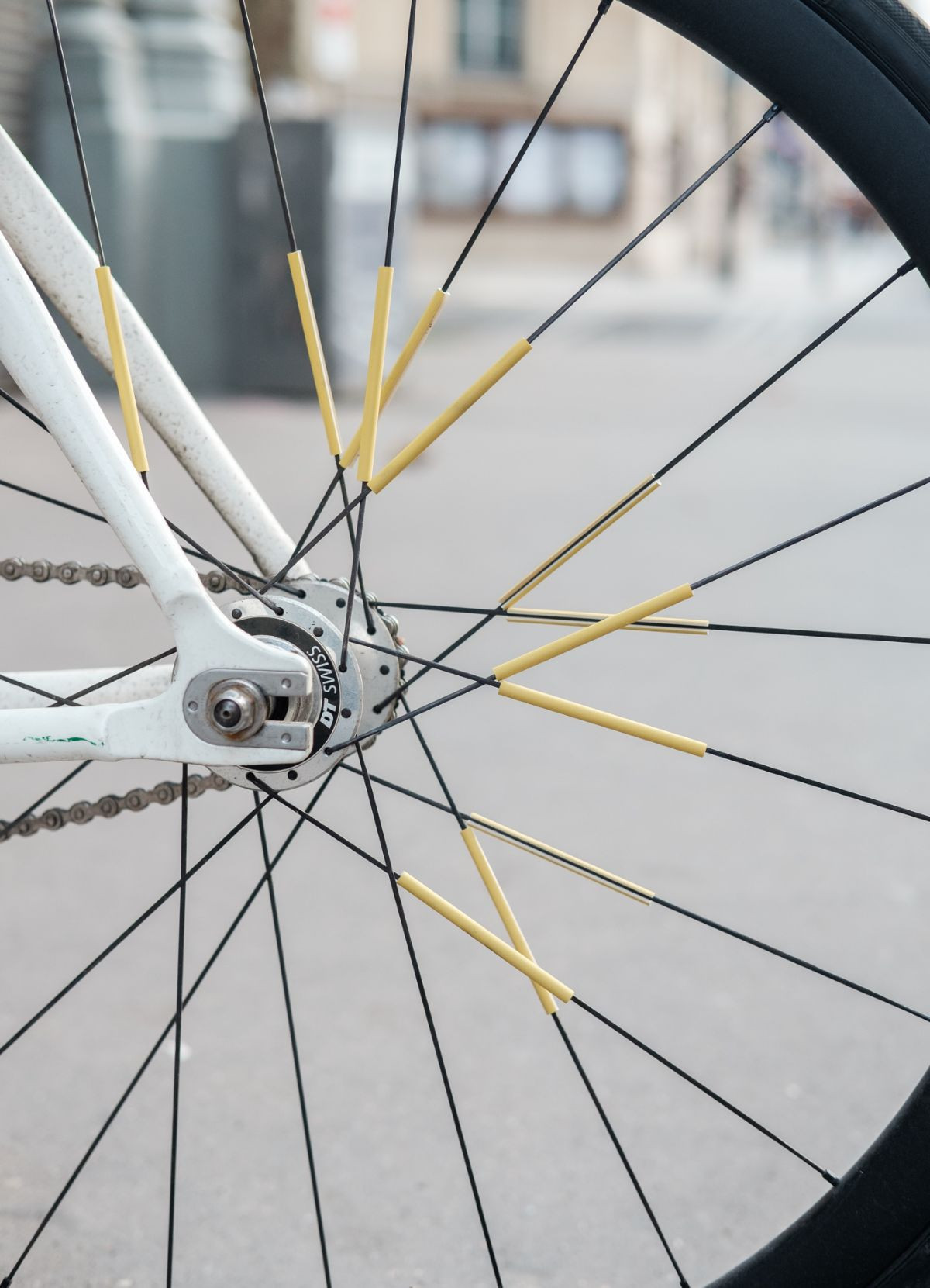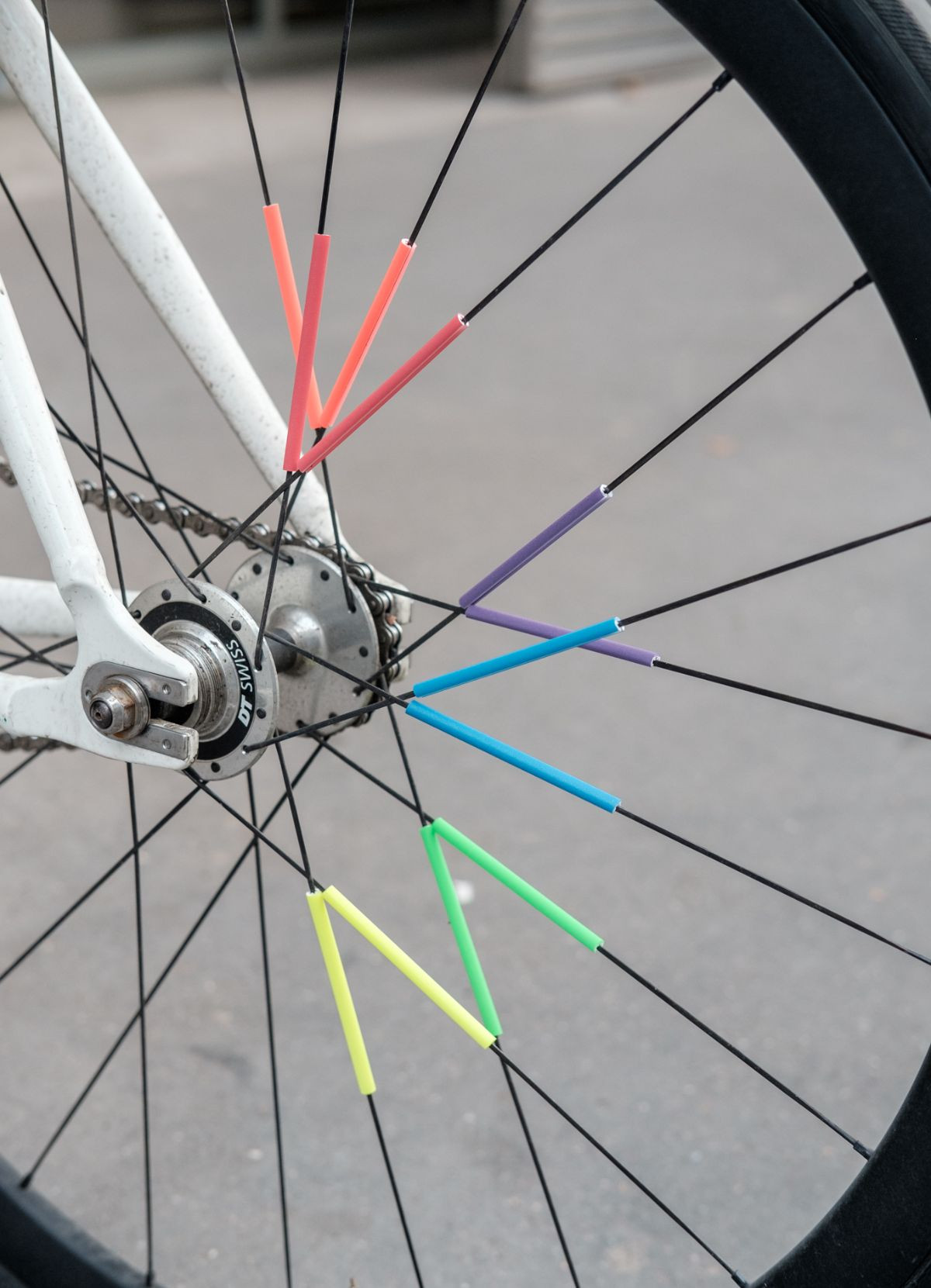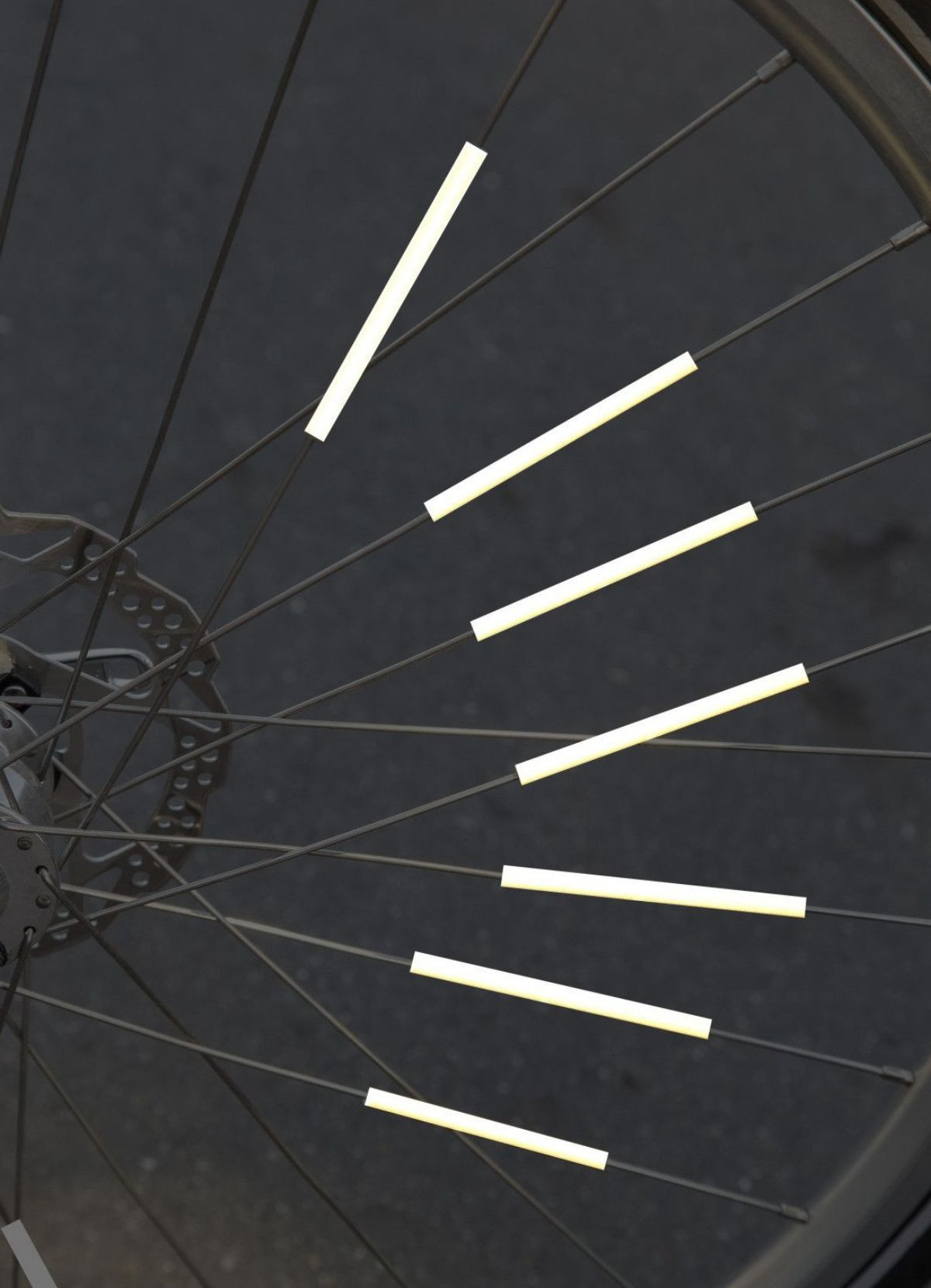 Les réflecteurs de rayon JE SUIS À VÉLO se fixent en un rien de temps sur tout type de roue.