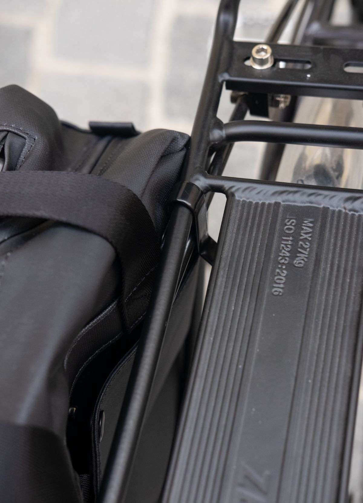 Détails rétro-réfléchissants sur le sac à dos porte-bagages étanche Lotus : sur le tissu du curseur des fermetures éclairs et sur les anses