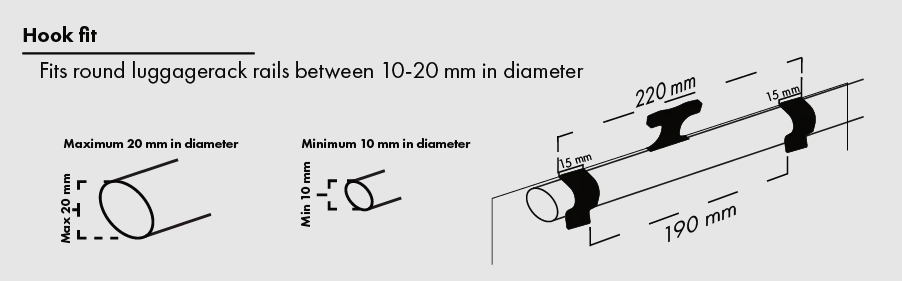 - Compatible avec les tubes de porte bagages de diamètre entre 10 et 15mm max (tous les porte-bagages classiques du marché).
